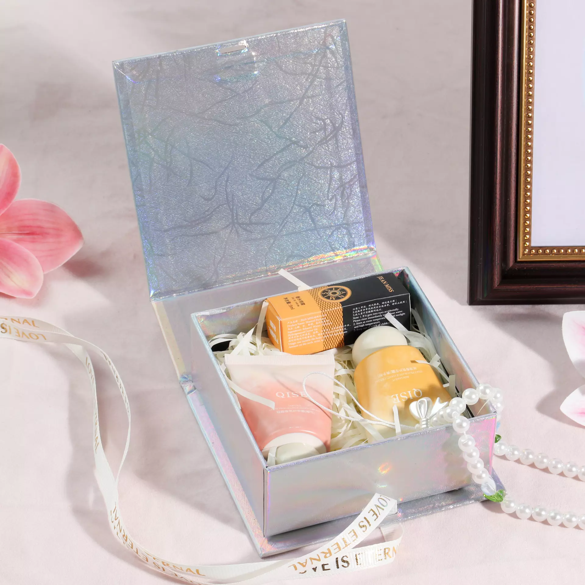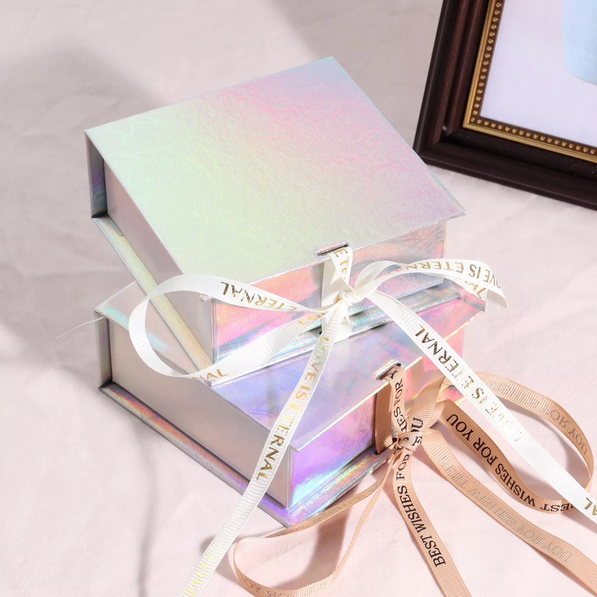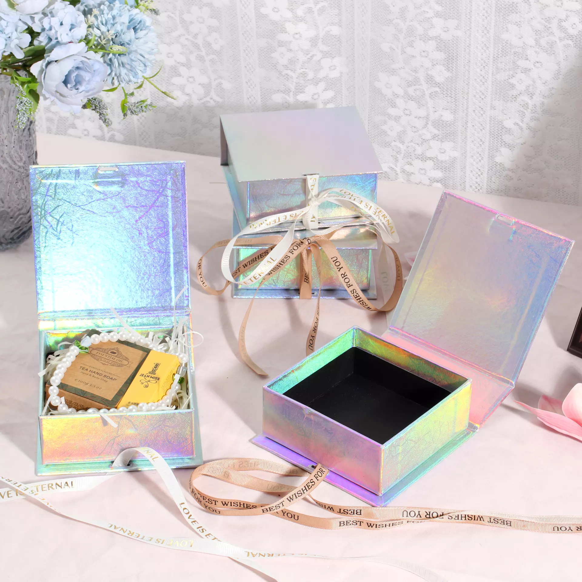 Holographic jewelry box, shiny holographic box, luxury glossy jewelry packaging Jewelry box with ribbon, satin ribbon gift box, decorated jewelry box Custom jewelry box, custom logo jewelry box, personalized jewelry packaging